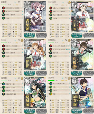 按wiki的攻略來說,需要用上1輕巡,2驅逐。 為了打boss,我用上1航巡,1重巡。為了對空,加賀是裝全對空的艦載機+爆戰,沒有裝彩雲。不用戰艦是為了避免頭兩場的戰鬥時,二回攻擊(這樣會增加危險性)。